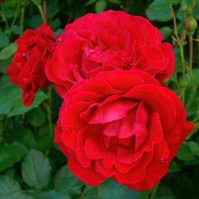 Куст формируется мощными с прочными побегами, имеет раскидистую форму, достигая в высоту 80-90 сантиметров при ширине около 70 сантиметров. Листва матовая, насыщенного темно-зеленого цвета, создающая идеальный фон для ослепительных соцветий. Каждый цветок крупный, диаметром 5-6 сантиметров, густомахровый, состоящий из примерно 25 лепестков округлой формы. Окраска представляет собой насыщенный густо-красный цвет с притягательным алым оттенком, который не выгорает на солнце. Цветки собраны в пышные кисти, где одновременно может распускаться от 20 до 25 бутонов, создавая эффектные цветовые пятна. Аромат у этой розы легкий и ненавязчивый.